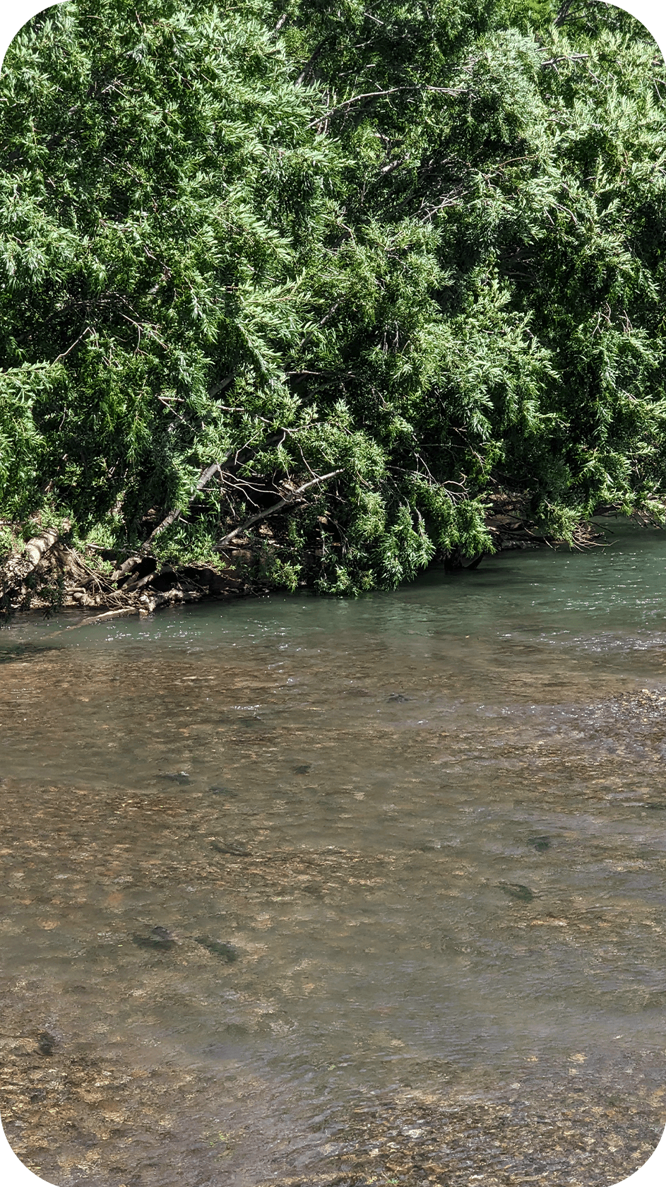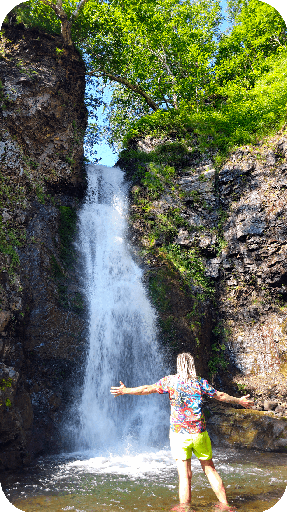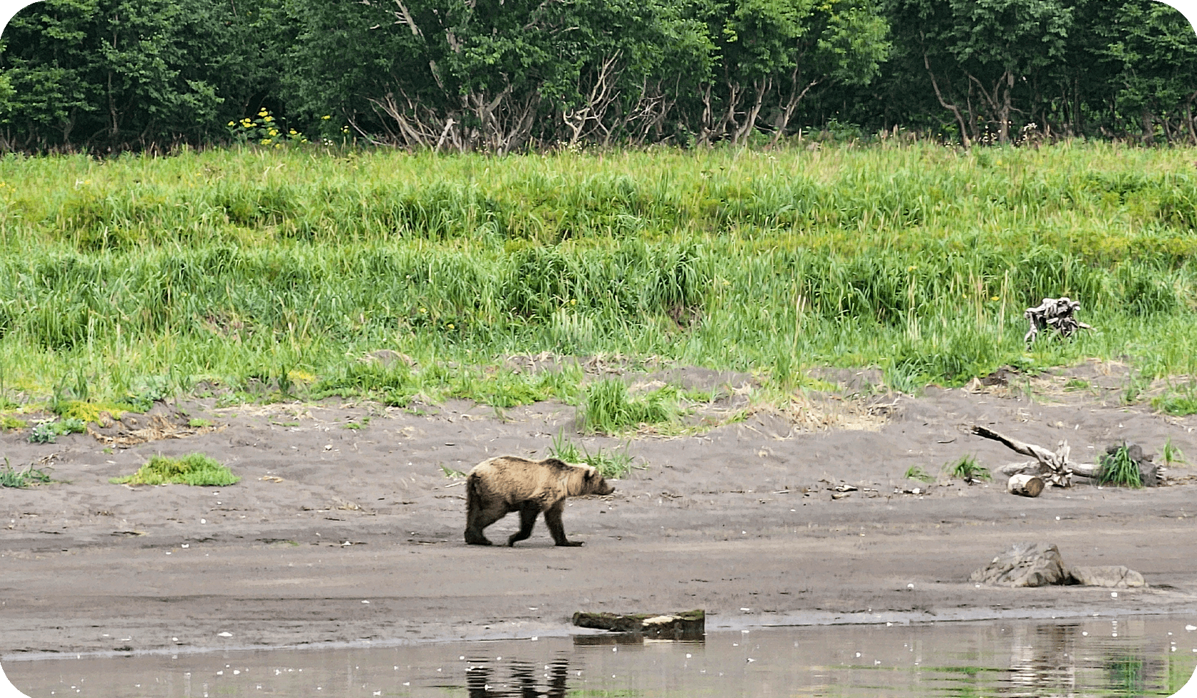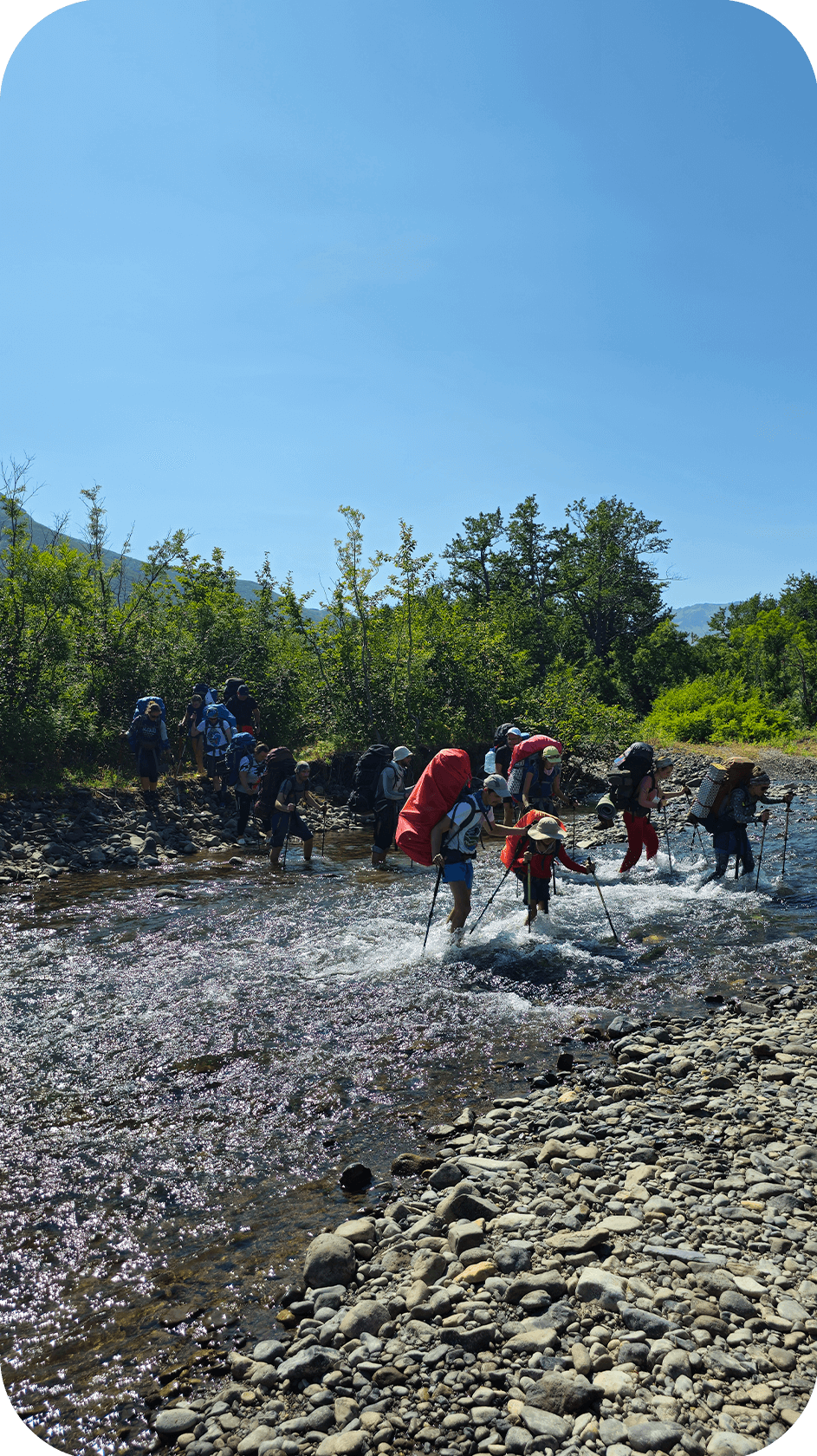 Спуск не легче подъёма: скользкая глина, камнепады, местами страховочные верёвки. К обеду спускаемся на поляну под перевалом — устраиваем перекус, отдыхаем. Вторая треть пути — проще: вдоль ручья с периодическими бродами (по щиколотку–колено). Третья часть — самая изматывающая: «пьяный лес» — невысокие деревья растут под невообразимыми углами, приходится нагибаться, пролазить, тропа петляет. К вечеру, уставшие, но довольные, приходим на Нижне- Вилючинские источники — горячий бассейн у реки, где можно отогреться и помыться. Ставим палатки, готовим ужин, греемся в воде.