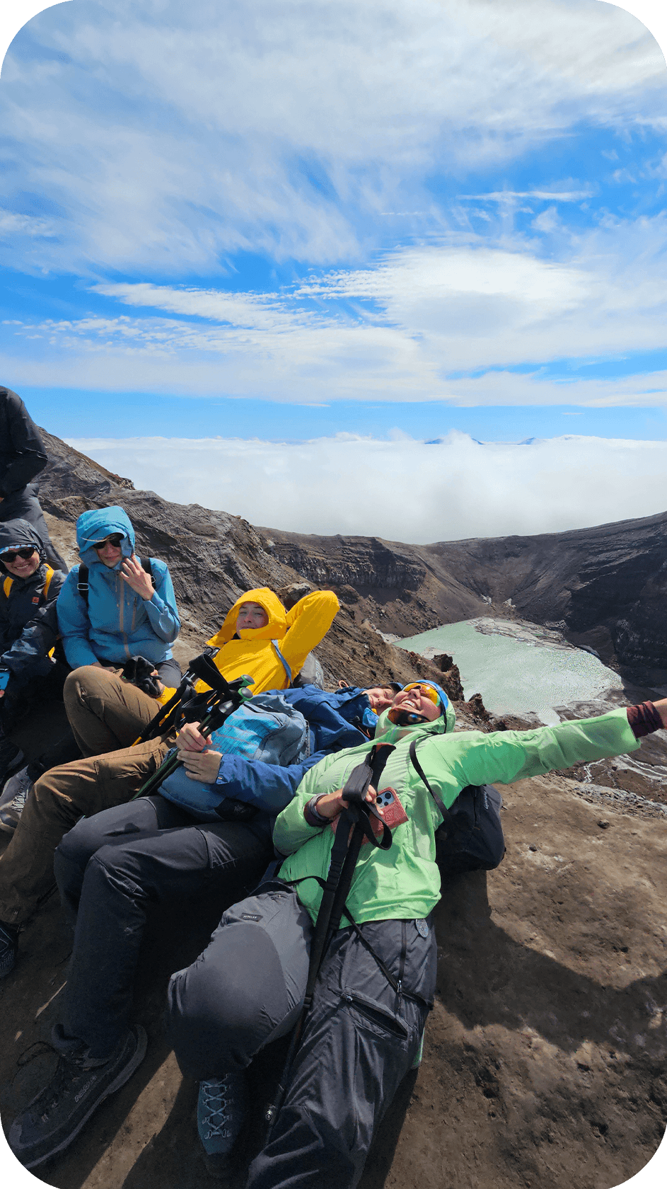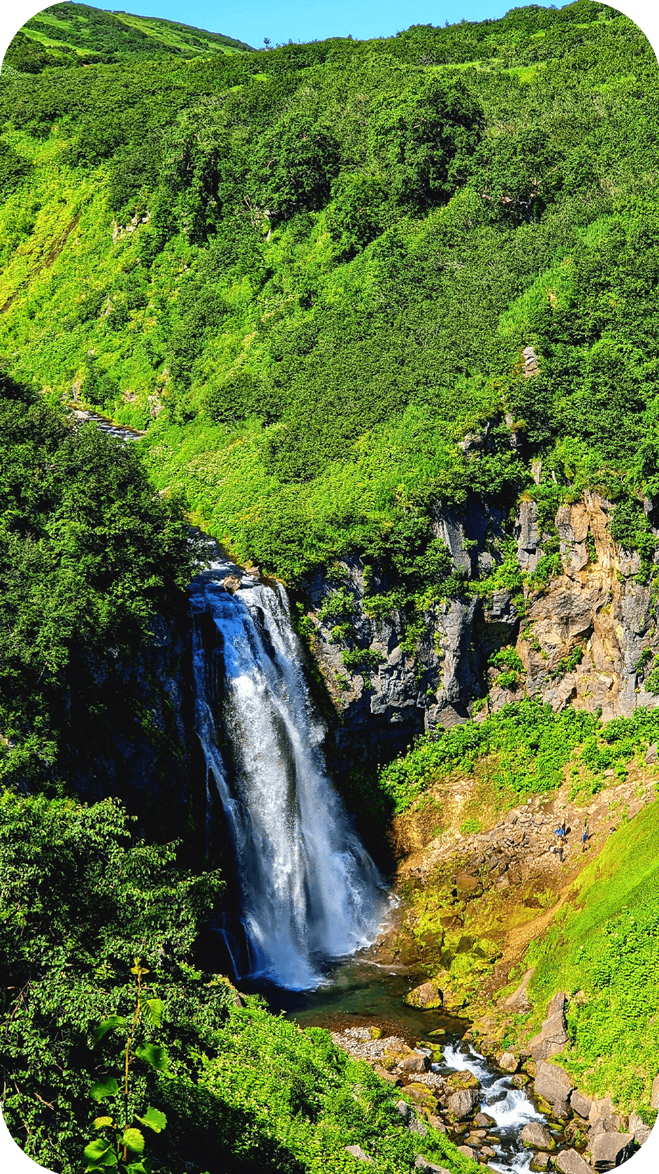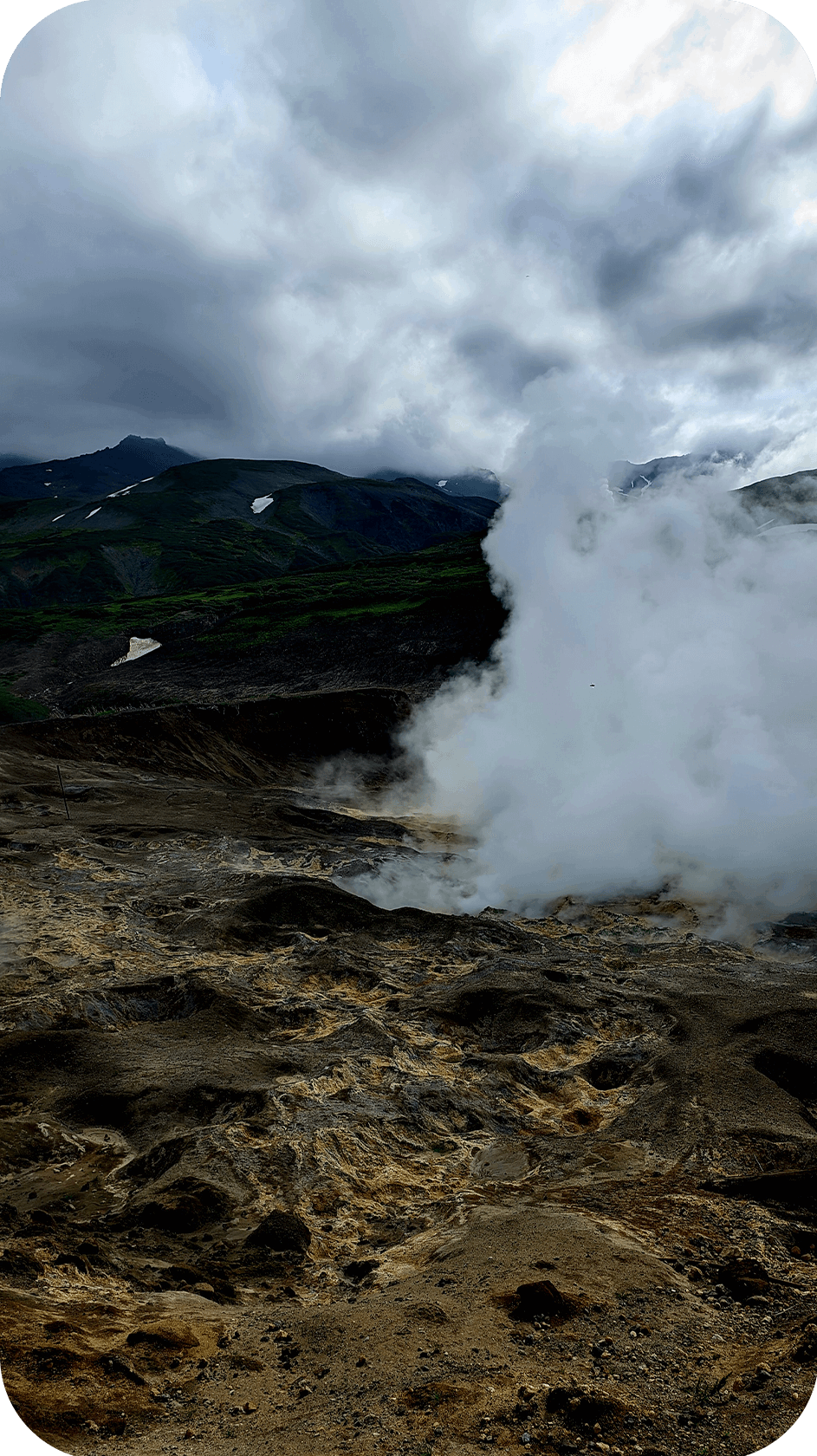 Встаём пораньше, дежурные готовят завтрак, все собирают лагерь и рюкзаки. Сегодня самый сложный день похода — переход через категорийный перевал Тенуева. Первая половина — крутой подъём по узкой тропе среди густого камчатского рододендрона: местами приходится протискиваться, карабкаться, помогать друг другу. Ноги горят, дыхание сбивается, но с перевала открывается шикарный вид на Вилючинский вулкан — один из самых красивых на Камчатке, с идеальным конусом и снежной шапкой.