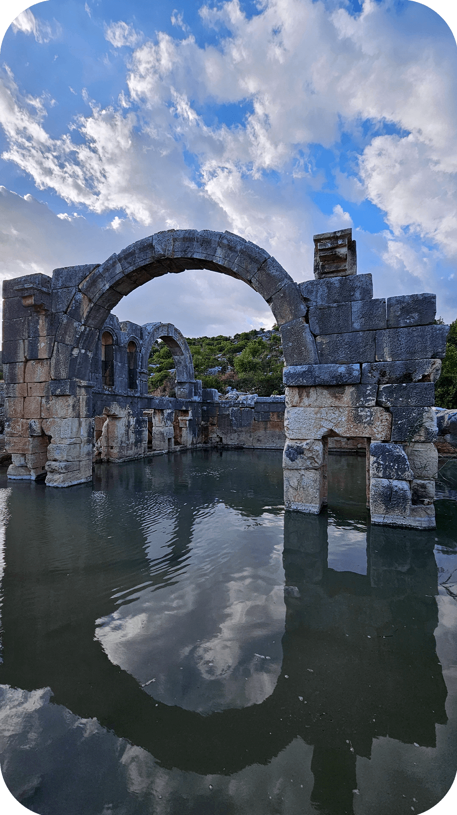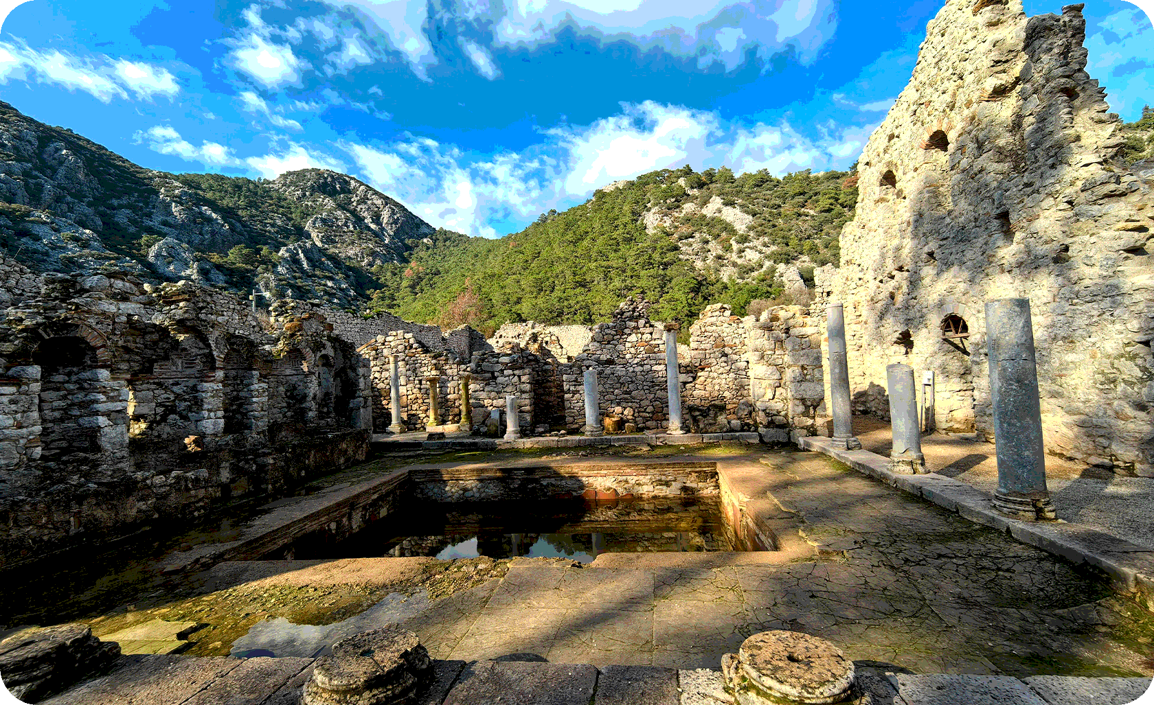 Затем идём в руины античного Олимпоса: гуляем среди заросших саркофагов, мостов и колоннад, устраиваем перекус в тени амфитеатра и слушаем рассказы о ликийской цивилизации, городе и самой тропе.